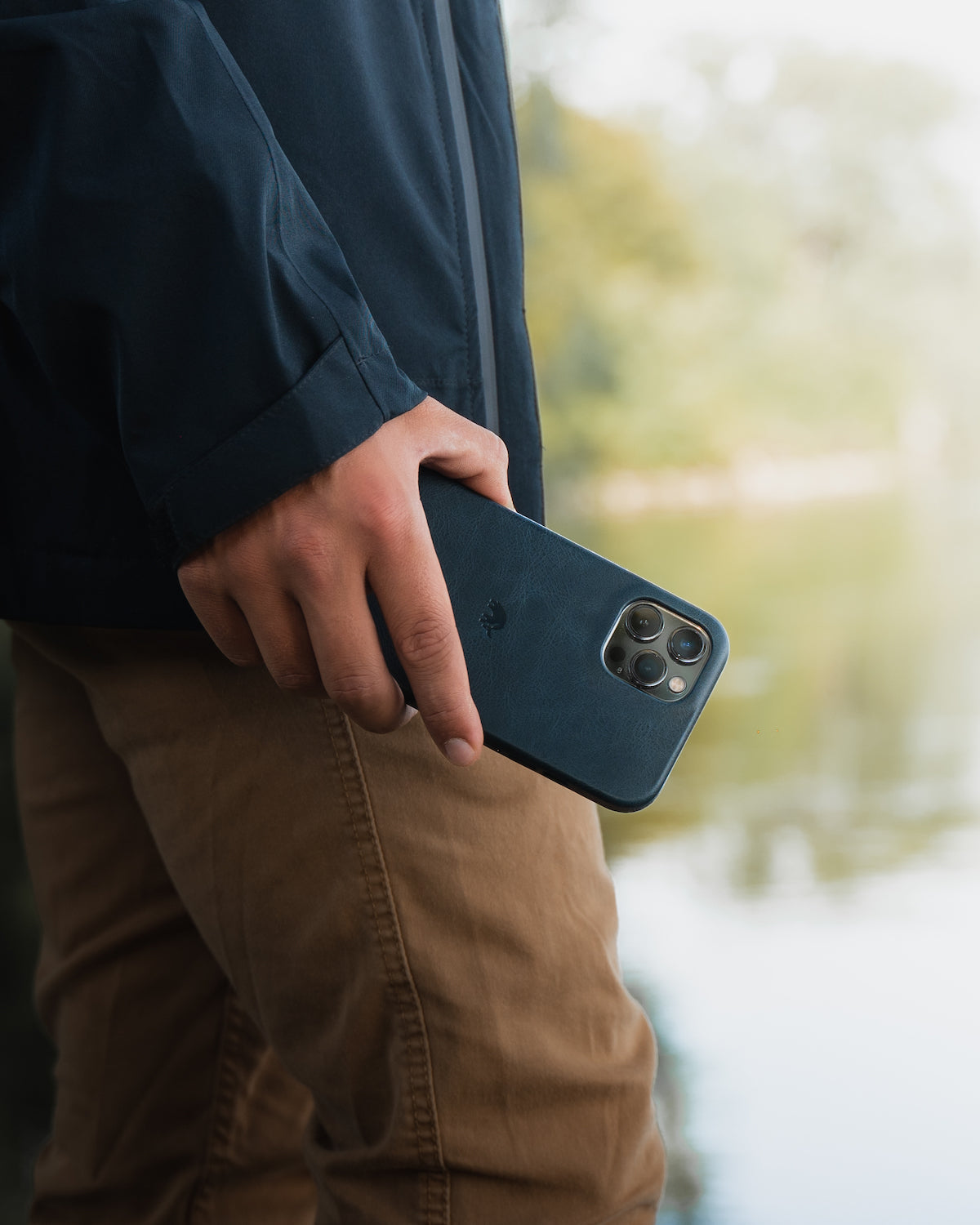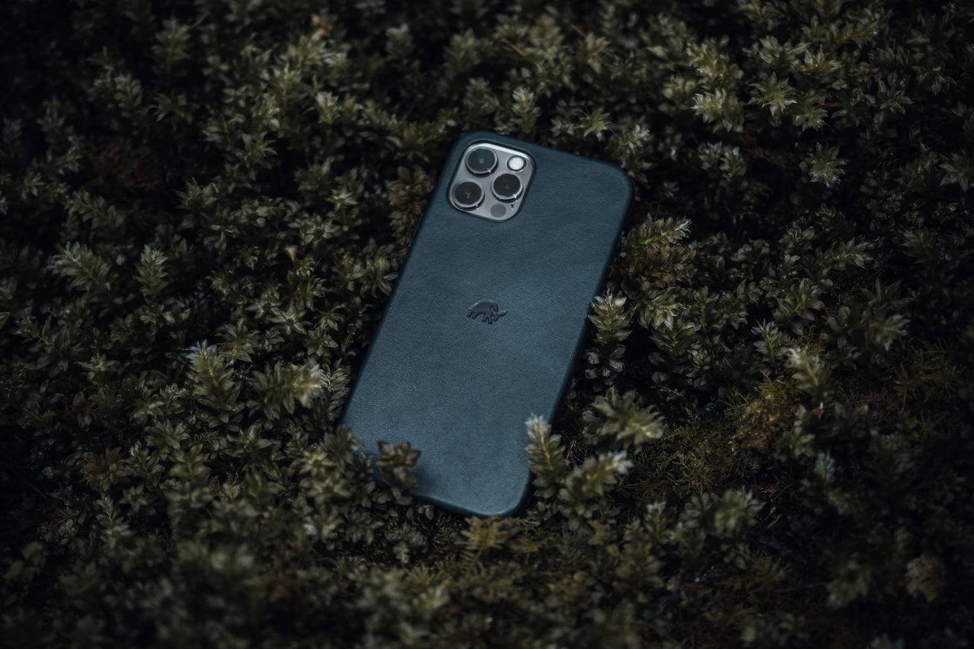 Dark blue leather phone case with small embossed animal logo on wooden table surrounded by accessories