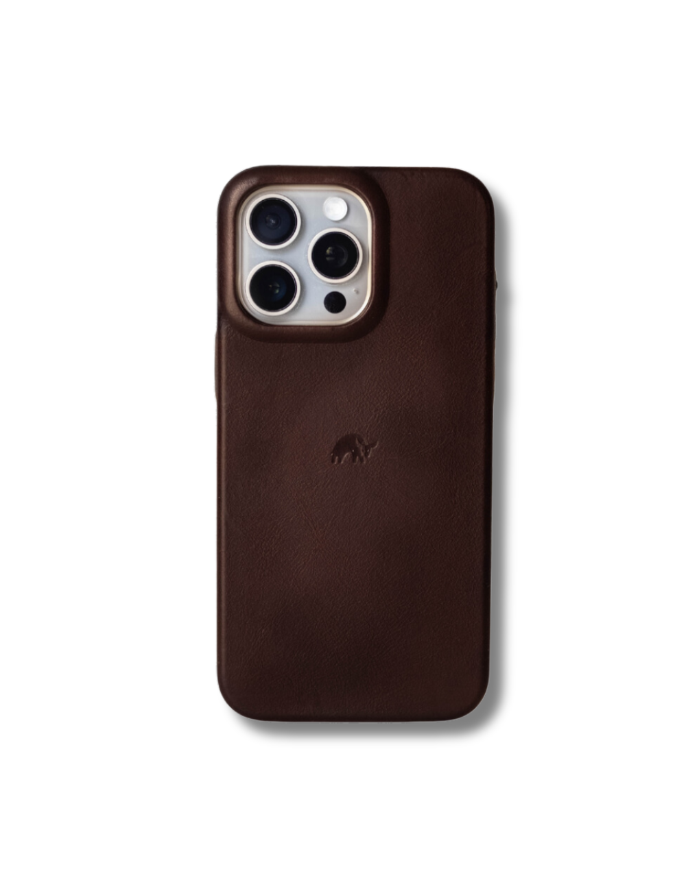 Brown leather iPhone case with camera cutouts on a wooden surface
